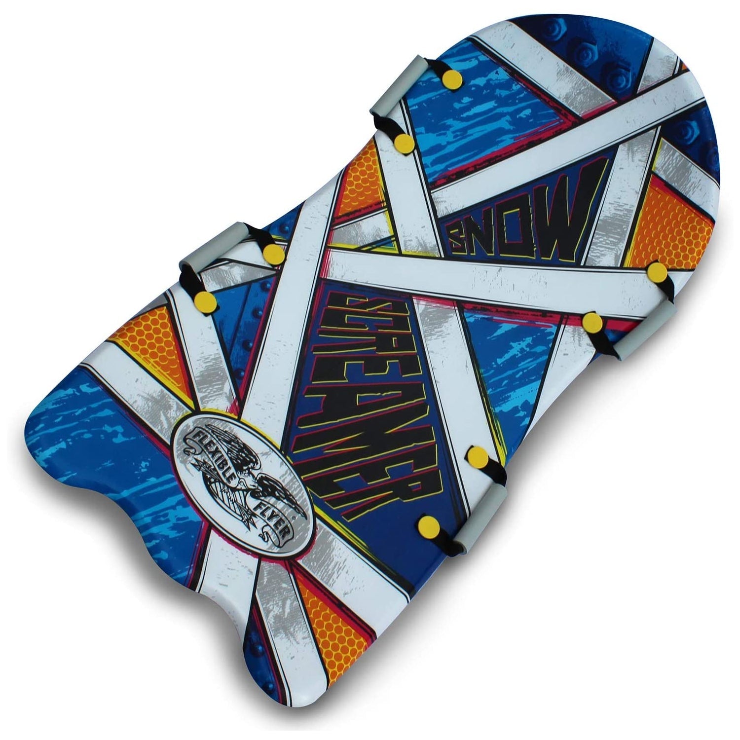 The Flexible Flyer Snow Screamer has modern looking graphics and a slick bottom for speed. Enjoy an exhilirating ride down the hill. It is big enough for one or two riders and it has four sturdy handles. This lightweight foam sled is made with polyethylene foam and has a soft foam construction. The laminated top and bottom is crack resistant, even in very cold weather. Lightweight, it is easy to carry. Recommended for ages 5 years and up.